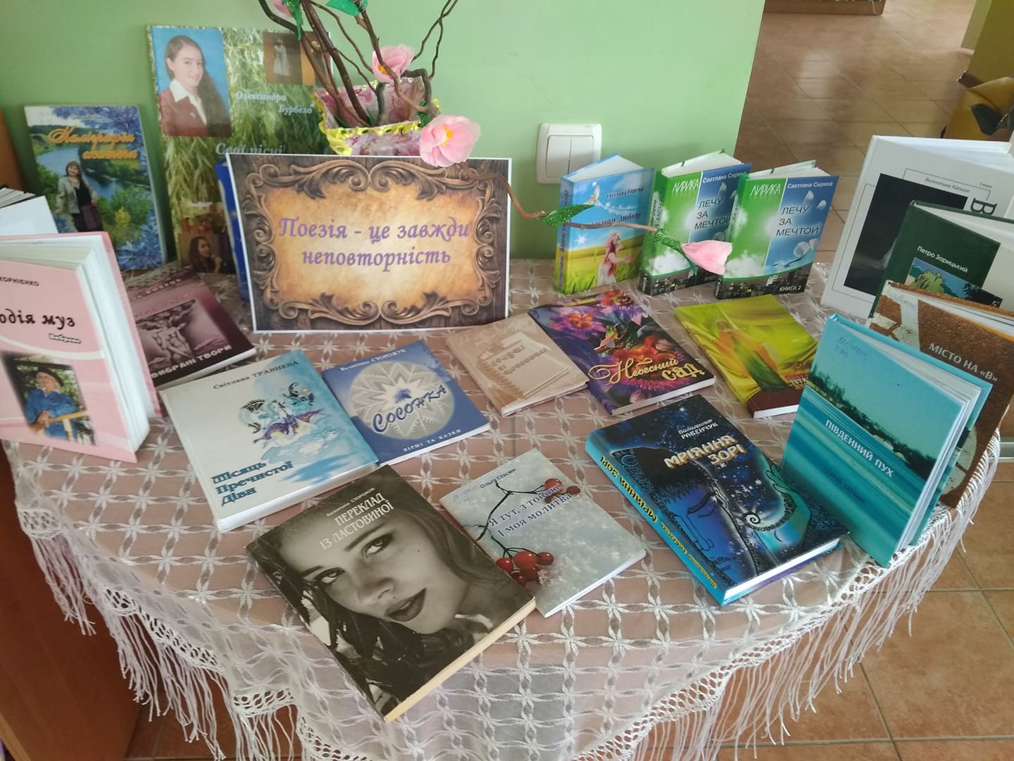 А ще деякі з них читали свої вірші в нашій бібліотеці. Зокрема це чудові та неповторні особистості Валентина Капшук та Світлана Сирена.Книги з їх автографами ми розмістили на виставці " Поезія - завжди неповторність"
